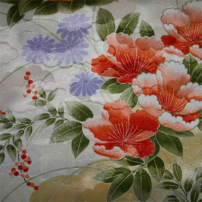 光沢に富んだアセテートの特性を活かして、華やかに染め上げられたこの生地も、某染色工場のデッドストックです。型が残っていませんから、再生産不可ですよ。