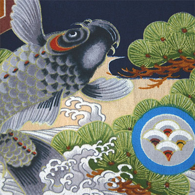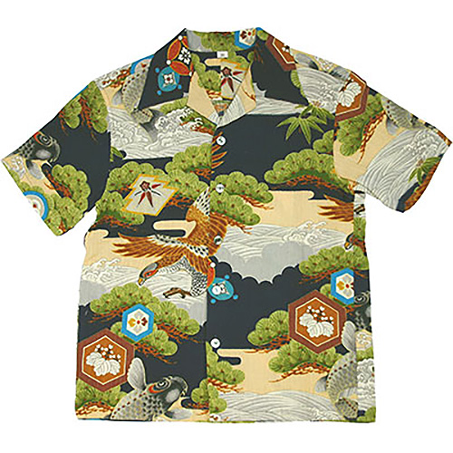 2001年以来の登場となる鯉鷹柄には、黒とも青とも違う渋みのある濃紺を背景に染色してみました。アロハシャツに踊る躍動感に満ちた真鯉と鷹が、一段と人目を惹きつけてくれるでしょう。